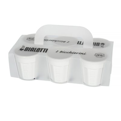 Komplet 6 filiżanek Bialetti, przeznaczonych do espresso. Filiżanki są wykonane z grubej porcelany w białym kolorze, a każda z nich jest ozdobiona logo Bialetti.